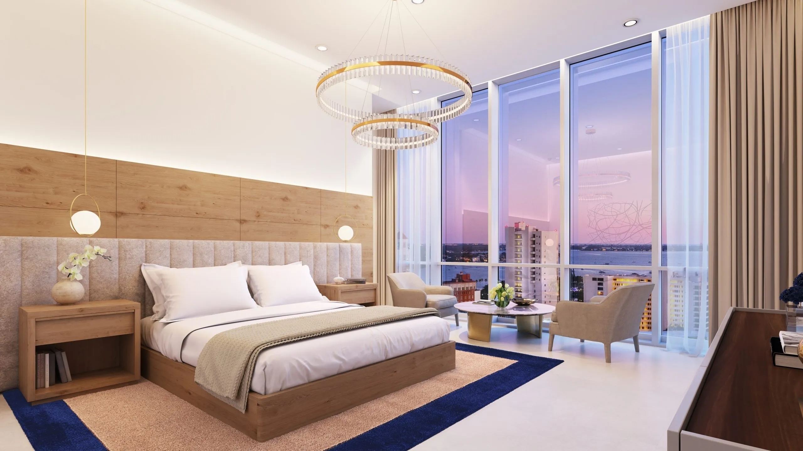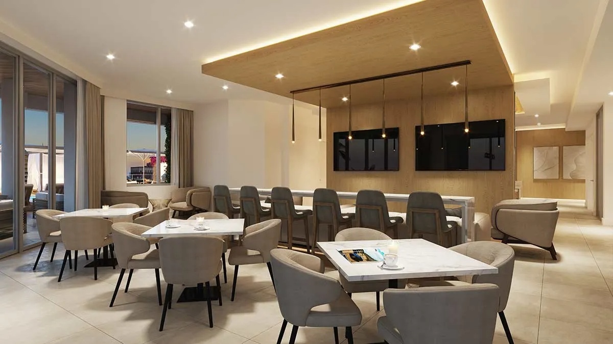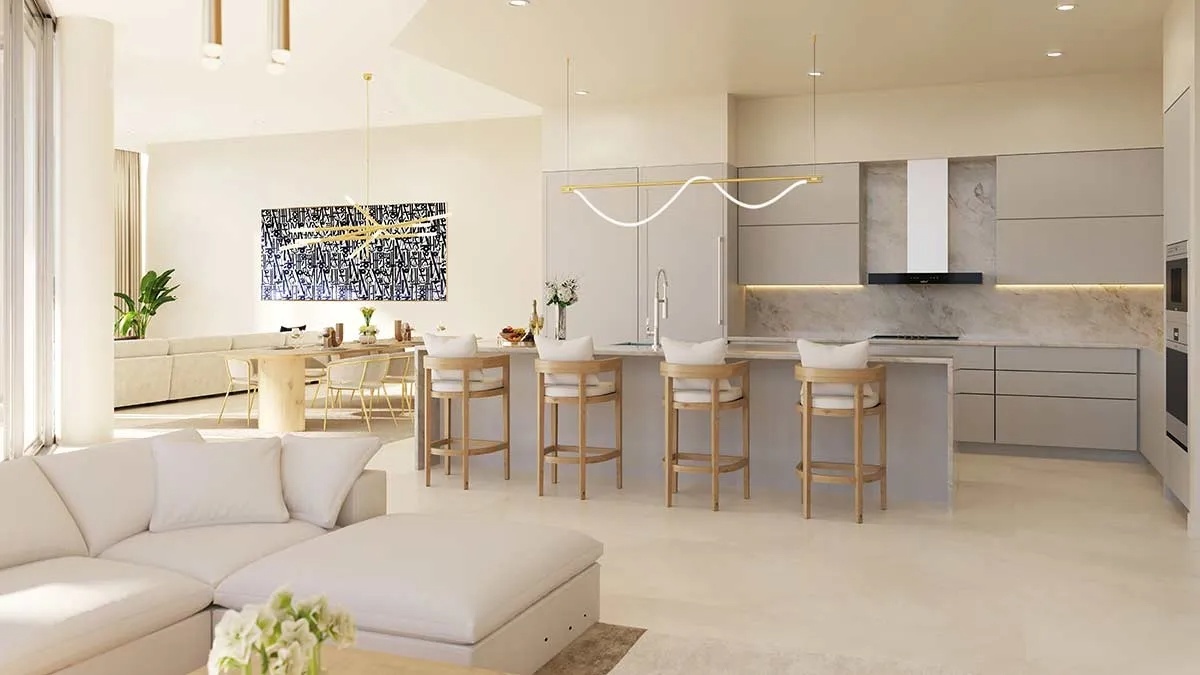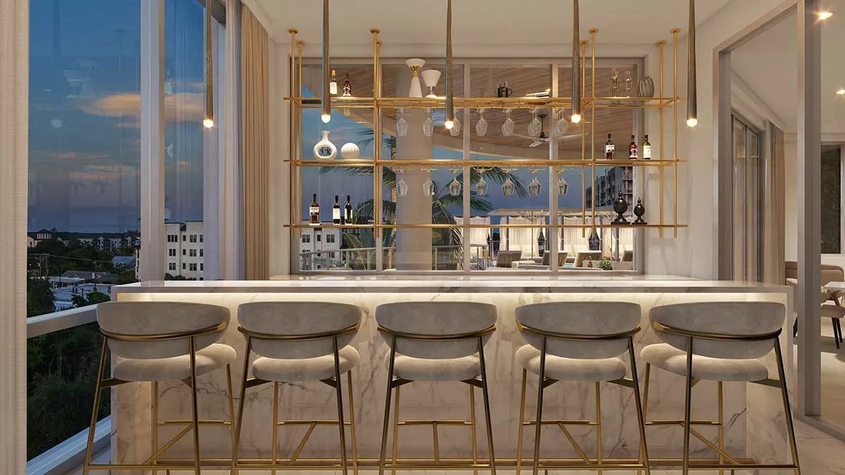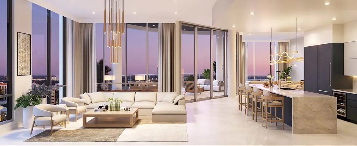 Residences: Expansive Layouts and Bespoke Finishes The residences at The EDGE Sarasota are designed to impress, featuring spacious floor plans ranging from 3,154 to 3,532 square feet of living space. Buyers can choose from 2-bedroom plus den or 3-bedroom layouts, all boasting soaring 12-to-14-foot ceilings and panoramic window walls that flood the interiors with natural light. Each condo includes a private access elevator and generous terraces with glass railings, ranging from 477 to over 700 square feet, perfect for enjoying Sarasota’s cityscape. The interiors are beautifully appointed with large-format porcelain tile throughout and designer kitchens equipped with premium Sub-Zero and Wolf appliances, gas cooktops, and walk-in pantries. The owner’s suites are true sanctuaries, featuring morning bars with modern cabinetry and refrigerated drawers.