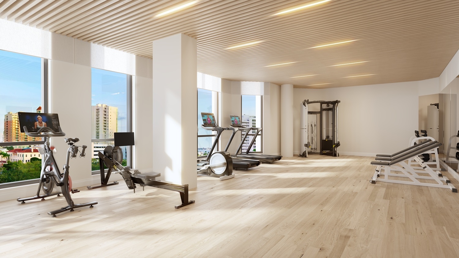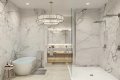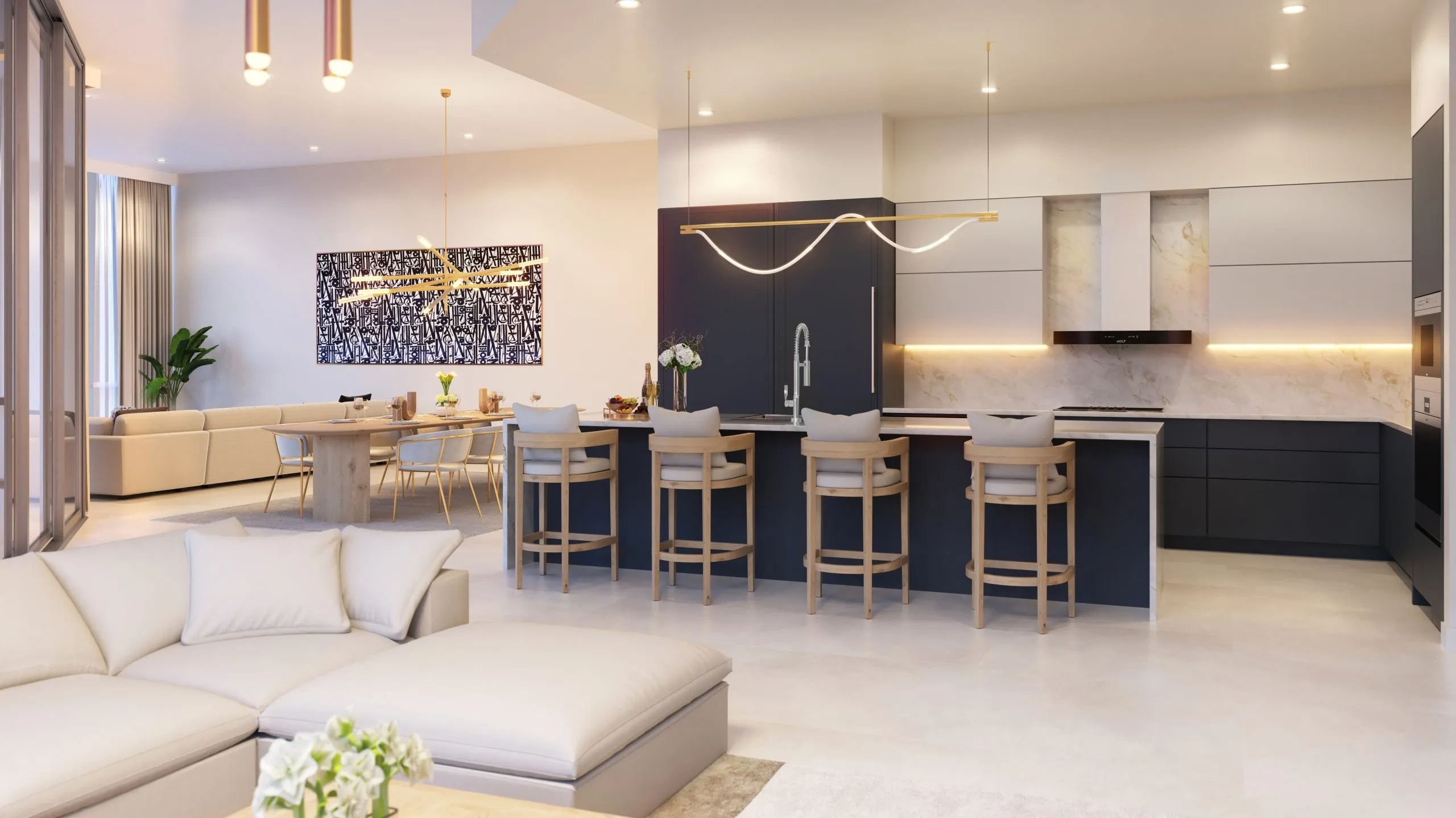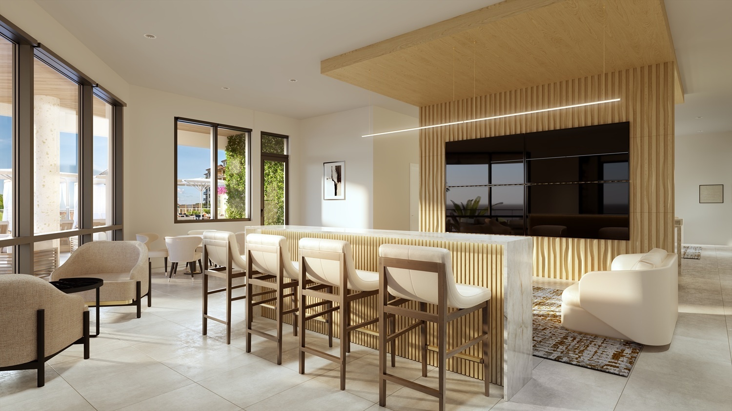 Residences: Expansive Layouts and Bespoke Finishes The residences at The EDGE Sarasota are designed to impress, featuring spacious floor plans ranging from 3,154 to 3,532 square feet of living space. Buyers can choose from 2-bedroom plus den or 3-bedroom layouts, all boasting soaring 12-to-14-foot ceilings and panoramic window walls that flood the interiors with natural light. Each condo includes a private access elevator and generous terraces with glass railings, ranging from 477 to over 700 square feet, perfect for enjoying Sarasota’s cityscape. The interiors are beautifully appointed with large-format porcelain tile throughout and designer kitchens equipped with premium Sub-Zero and Wolf appliances, gas cooktops, and walk-in pantries. The owner’s suites are true sanctuaries, featuring morning bars with modern cabinetry and refrigerated drawers.