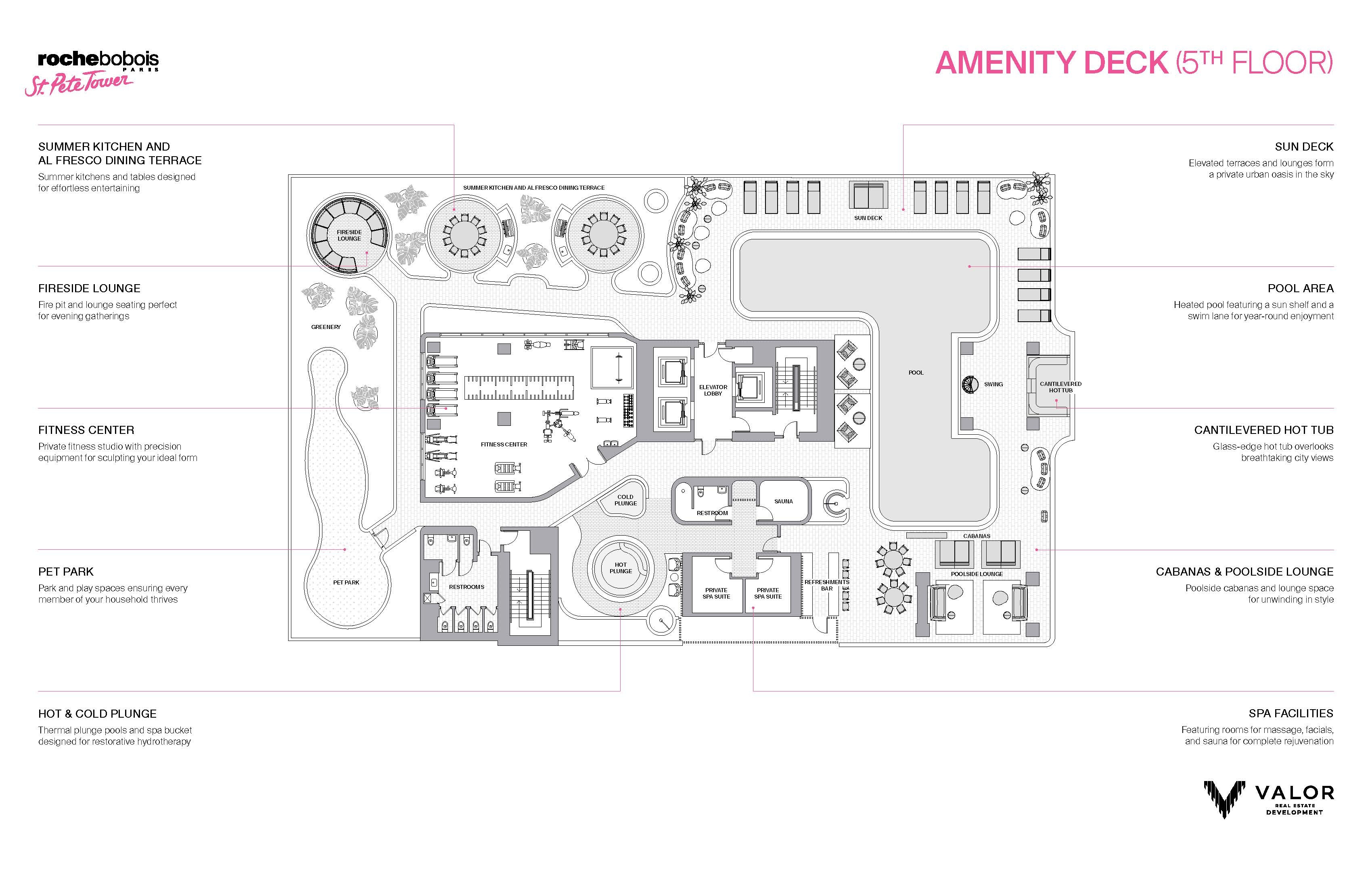 The building's amenities are designed for a luxurious lifestyle, centered around a vibrant ground-floor experience and an expansive amenity deck: